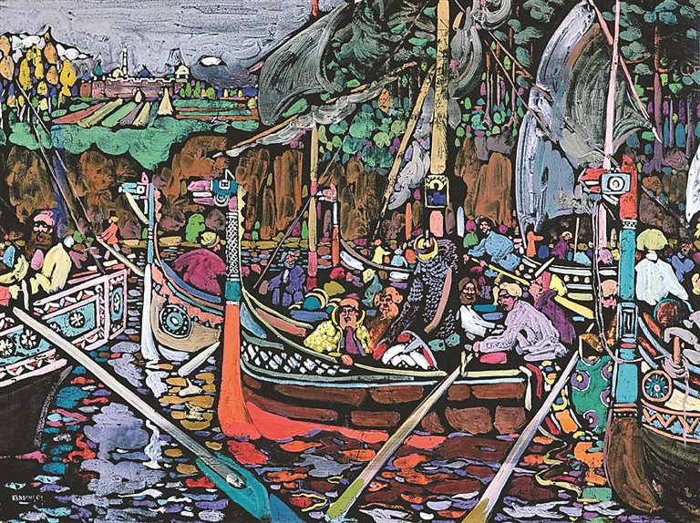 尽管画面远处山坡上的一排建筑物,不禁让人想起东方的某座城市,但是画中的人物却是身着传统俄国服饰的水手。伏尔加河是俄罗斯文化历史的摇篮,被称之为母亲河,康定斯基以伏尔加河作为故事发生的场景,河面上风帆扬起,群舟竞发,一片喧嚣。