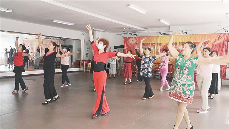 另一教室传来鼓乐声,只见30多名银发老人正在打腰鼓。其中,岁数最大的是79岁的王阿姨,她原是一名教育工作者,偶然的机会喜欢上了鼓乐,便参加了抚顺社区的腰鼓队,目前在队已有10年了,虽然家里有百岁母亲需要照料,但她与老伴轮班守候,一得空儿便来排练。