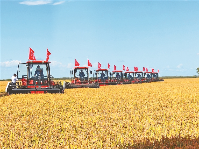 在北大荒集团江川农场第一管理区,一片开阔稻田中,随着一声“开镰!”,彩色烟花腾空,8台自走式割晒机一字排开,在金色的稻浪中向前开动。仪式现场,江川农场与厦门国贸集团、垦丰水稻科技有限公司分别签订7.3万吨、1.9亿元优质稻米订销合同和15万亩高端优质米种植基地框架协议。