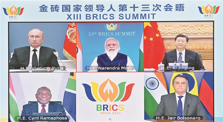 五国领导人充分肯定金砖合作15年来取得的成就,认为今年以来面对前所未有的挑战和复杂国际形势,五国携手抗击新冠肺炎疫情,推动各领域合作取得丰富成果,提升了新兴经济体国家的地位,愿继续共同努力,深化金砖战略伙伴关系,推动金砖合作取得更多务实成果。五国领导人表示,将继续推动全球团结抗疫,反对将病毒溯源政治化,愿加强公共卫生和疫苗合作,推动疫苗公平可及,促进世界经济强劲复苏,努力实现2030年可持续发展目标。各方重申支持多边主义和国际关系基本准则,反对单边主义、霸权主义,主张各国相互尊重独立、主权和平等,将就重大国际和地区问题加强沟通协调,合力应对气候变化,推动构建人类命运共同体。巴西、俄罗斯、印度和南非支持中国主办北京冬奥会、冬残奥会,支持中国2022年金砖主席国工作并主办金砖国家领导人第十四次会晤。