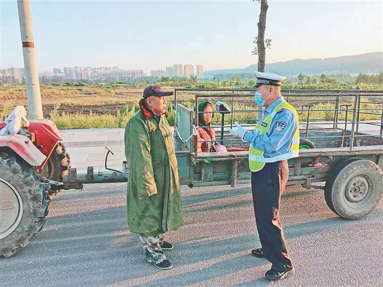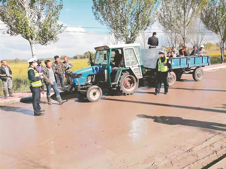 10日5时38分,富裕公安局交通管理大队执法人员在富裕龙安桥镇小河东一公里处,发现农用拖拉机上载人行驶,立即进行截停。经查该车载有17人去附近村屯办丧事,车主还没有带驾驶证。执法人员让车上人员自行离开,并对四轮车驾驶员进行处罚。