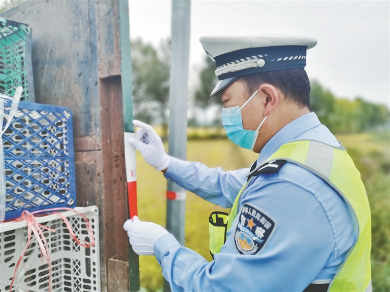 10日10时,记者跟随牡丹江公安局、交警支队等部门的执法人员来到牡丹江市西安区海南乡的中兴村执勤点,看到这里有很多电动三轮车往返。执勤民警告诉记者,这个执法点是沙虎村和中兴村村民出行的必经路口,所有的农用车出村都会在这里进行检查,还有一部分是来粘贴反光条的。