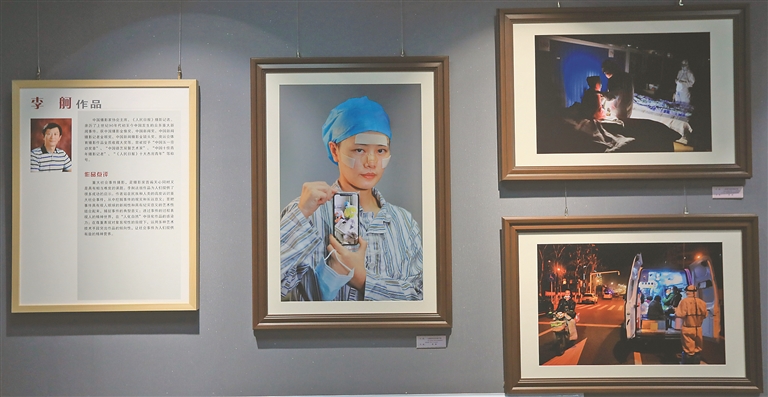 “此次展出的摄影作品中有来自中国摄影家协会主席李舸的作品,他的作品都是反映重大社会事件的。”展馆负责人张清环介绍。李舸的系列作品《一座城市的抗疫历程》记录着医护人员与患者之间发生的故事。参与抢救生命的福建援鄂护士徐建下班后走出病房,摘下口罩,露出满是压痕的脸;治愈患者感谢救治他的医护人员,看到他们摘下口罩的真面目感动落泪的场景。这些真实的画面让人忍不住驻足观看。展厅里,李悦女士带着孩子一边参观一边给孩子讲照片里的故事,孩子看着照片频频点头。她告诉记者:“带孩子多逛一逛博物馆,了解一下我们国家的历史文化和当代故事,我觉得对孩子来说非常好。”