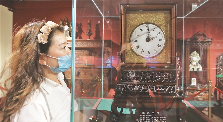 玻璃柜中的南京本钟作为这些钟表中的“老大哥”,静静地伫立在钟表收藏馆的中央,见证着时代的变迁。据场馆的工作人员介绍:“南京本钟,1875年生产于清代,是由上海‘美利华’张恒隆手工作坊打造,配有两个报时铃,分别报时。从钟的外观可以看到钟表由屏风式红木架镶嵌,钟盘镀金,外部镌刻着花纹,造型古朴典雅,体现了鲜明的民族风格。南京本钟在1915年巴拿马国际博览会上曾获得金质奖章。”百余年前中外钟表高超的制作直到今天也依然让人叹为观止。