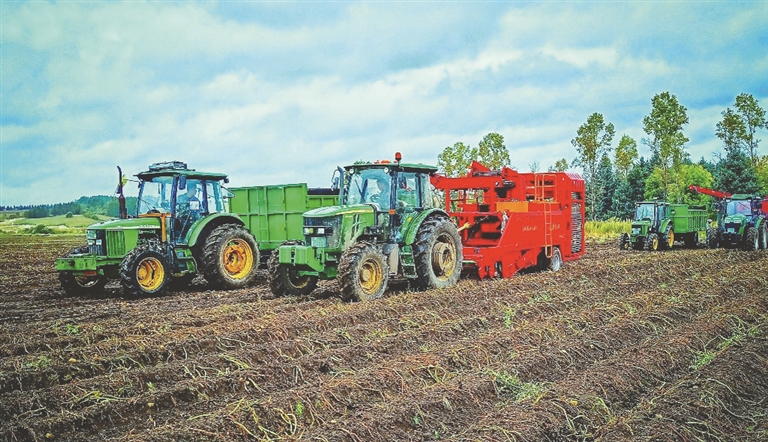 该公司种植马铃薯面积1.18万亩,主栽延薯4号、垦薯1号和兴佳2号等系列品种。针对近期多雨天气,该公司组织了48台马铃薯灭秧机、起收机和联合收获机,组成收获机群,进行集中抢收作业,确保“薯薯”归仓。