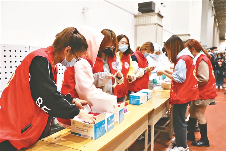 志愿者为核酸检测试剂管贴标签。 哈师大团委提供