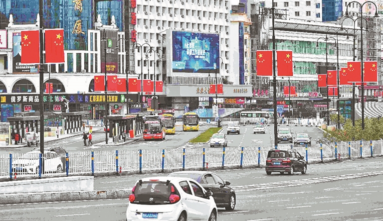 图为哈尔滨火车站前挂满国旗。黑龙江日报全媒体记者 邵国良 黑龙江日报全媒体见习记者 张春雷摄