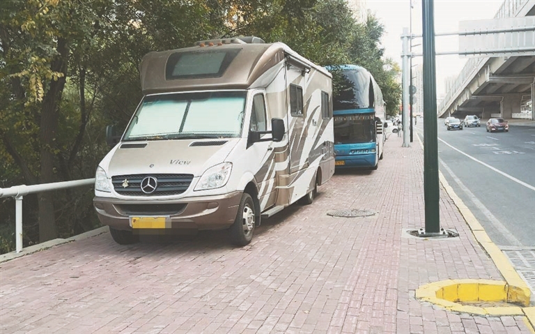 暗访问题:二手车商店将车辆进出的垫板架在人行道上,影响行人通行