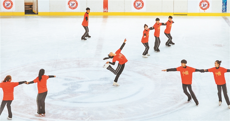 27日,哈尔滨体育学院迎接北京2022年冬奥会倒计时100天启动仪式暨第34届冰上运动会开幕式在该校滑冰馆举行,哈体院学子以亲身参与冰雪运动的方式,迎接北京冬奥会。