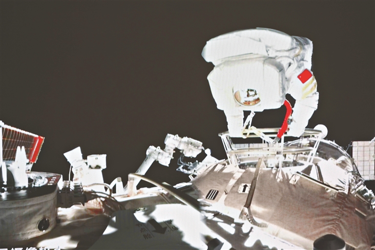 据中国载人航天工程办公室消息,北京时间2021年11月7日18时51分,航天员翟志刚成功开启天和核心舱节点舱出舱舱门,截至20时28分,航天员翟志刚、王亚平身着我国新一代“飞天”舱外航天服,先后从天和核心舱节点舱成功出舱。王亚平成为中国首位进行出舱活动的女航天员,迈出了中国女性舱外太空行走第一步。 新华社发