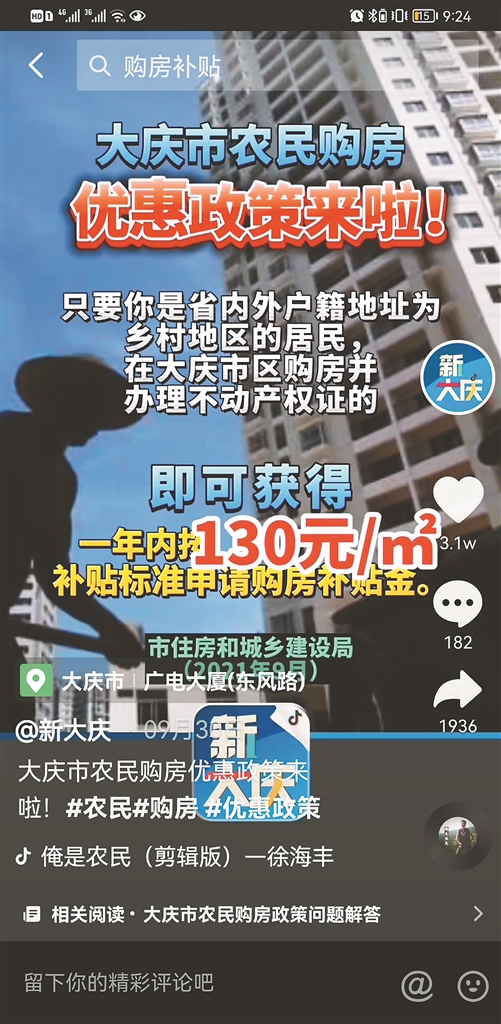 抖音推出大庆购房新政后,受到网友广泛关注。