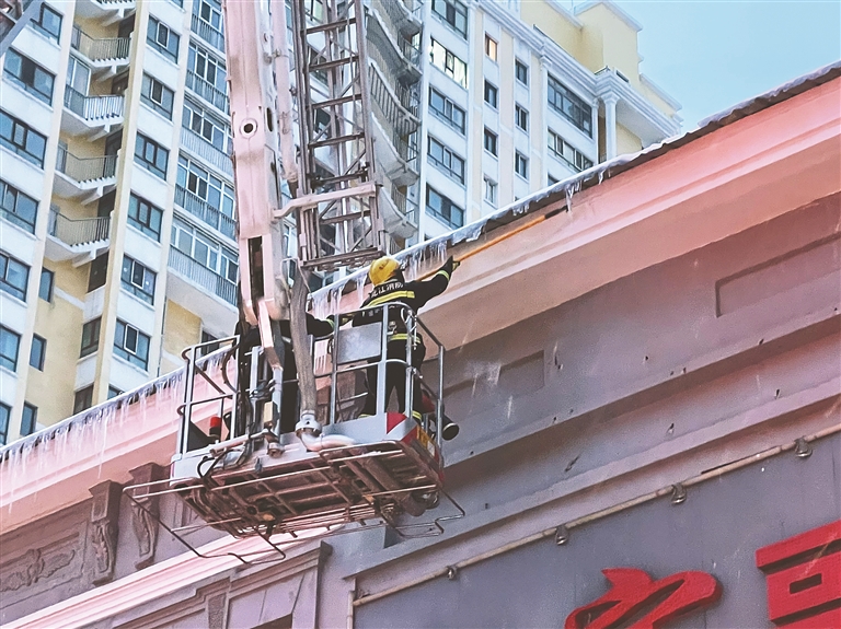 消防队员清理冰溜子。黑龙江日报全媒体记者 蒋国红摄