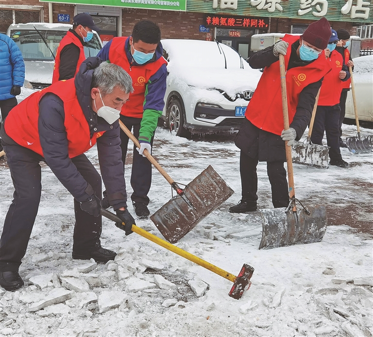 本报讯(刘喆 黑龙江日报全媒体记者刘莉)10日9时许,在哈尔滨市香坊区民生大厦周边街路,一场热火朝天的志愿清冰雪活动正在进行中。虽然天气寒冷,但志愿者们热情不减,带动了一些居民积极响应。他们拿出自家的清冰雪工具认真清理单元门前的积雪,献出自己的一份力量。