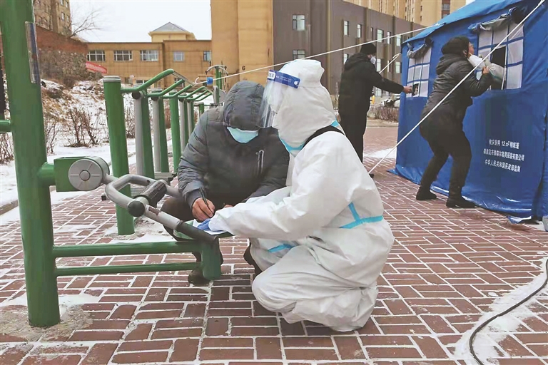 “护士累得坐雪地上了,爬六楼七楼给我们做核酸。太累了。”一位黑河市民拍下视频,记录医务人员的艰辛。每个落雪的日子,黑河人民都会想起这个冬季的“天使白”。截至11月15日,黑河市爱辉区开展13轮全民和8轮重点地区重点人群核酸检测,累计检测出核酸阳性271例。