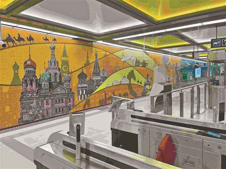 会展中心站墙面上的艺术品《浪漫丝绸路》,是以“一带一路”为主题,哈尔滨为中心,构建“中蒙俄经济走廊”黑龙江陆海丝绸之路经济带。作品采用拼贴融合的艺术手法,运用具象与抽象共存的艺术语言表达形式,画面中流畅的曲线好像是飘逸的丝带,象征着丝绸之路,同时也象征国际间的经济与文化交流;流畅的线条层次分明,疏密有序,线条在画面的东北角汇聚,象征着哈尔滨作为龙江丝路带建设的龙头,是亚欧大陆桥经济文化交流的关键枢纽。丰富多彩的画面表达着人们对和谐美好生活的期待,凝聚着人类命运共同体的发展大趋势。