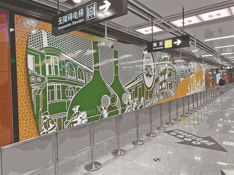 油坊街站位于哈尔滨市轴承街与红旗大街辅路交口,临近油坊街。记者注意到,该站的艺术品以《魅力哈啤》为主题,传递哈啤的历史,表现啤酒给市民生活带来的乐趣。艺术品用写实的手法表现了啤酒瓶被开启,啤酒花喷涌而出那一瞬间的状态,在瓶身内生动还原了哈尔滨啤酒从传入到生产、发展的历史故事和文化内涵;喷涌而出的啤酒花增加了作品的动感,将哈尔滨人豪爽奔放的性格和畅快的啤酒文化表现得淋漓尽致。无边框的设计也使艺术品与周边环境完美融合,传递了更为生活化的主题色彩。这种夸张且极具视觉张力的艺术表现手法,十分适合市民打卡拍照,极大增强了作品的互动性与参与性。