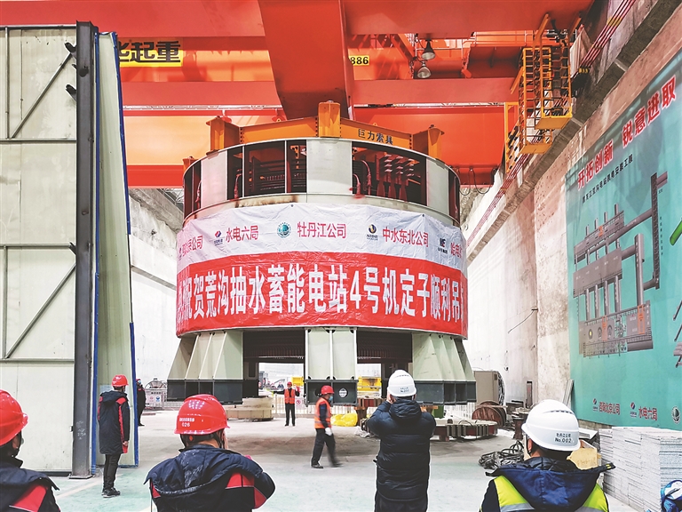 近日,黑龙江荒沟抽水蓄能电站最后一台机组定子吊装顺利完成,该水电站向着投产发电目标又迈出了坚实一步。荒沟抽水蓄能电站是省百大项目之一,也是我省首座大型抽水蓄能电站,该项目于2014年5月开工建设,主要担负黑龙江电网及东北电网调峰、调频和事故备用任务。项目总装机容量120万千瓦,总投资58.03亿元。全部4台机组将于2022年9月份实现投产发电。
