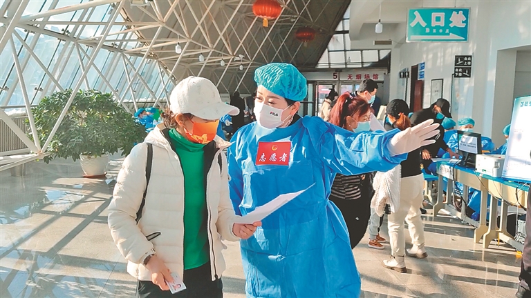绥芬河志愿者在疫苗接种点为市民服务。田晓慧摄