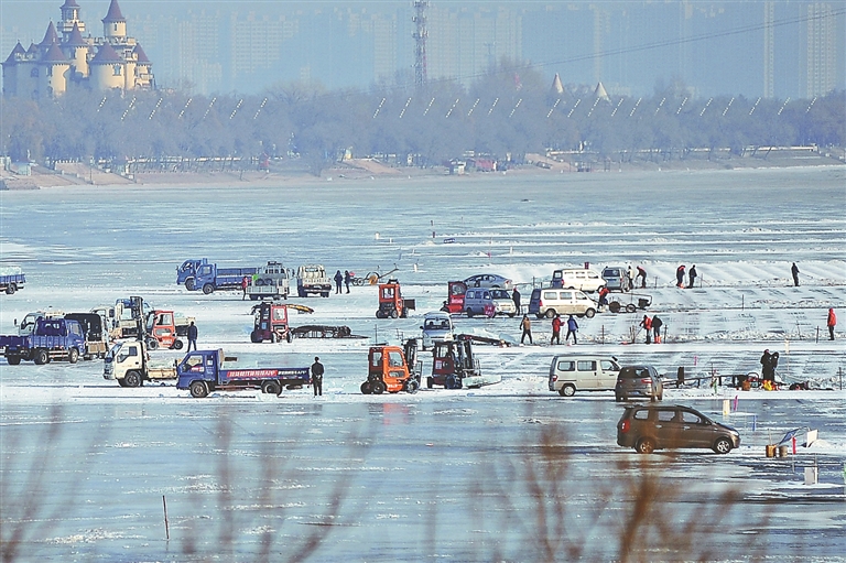14日,哈尔滨市松花江公路大桥北侧江面上,工人们正在忙着取冰。