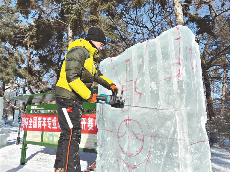 近日,第二届“华德杯”全国青年专业冰雕比赛在第48届冰灯艺术游园会举行。国内各高校师生及青年冰雪艺术家通过冰雕艺术语言表达对冬奥成功举办的美好祝愿。 刘桂杰 黑龙江日报全媒体记者 郭俊峰摄