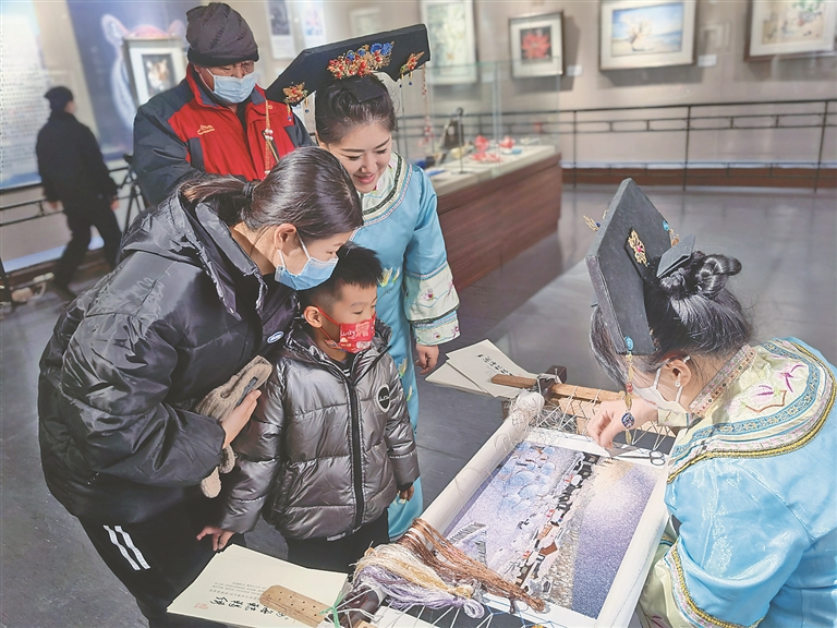 元旦期间,黑龙江省博物馆《国家级非物质文化遗产渤海靺鞨绣精品展》吸引大批的市民前来参观,在假期里感受非物质文化遗产的独特魅力。 本次展出的满绣作品制作技艺精良考究,制作风格散发着浓厚的乡土气息。作品惟妙惟肖,观者如临其境。完美地展现了黑龙江的地域风光,民族风情,其绣品内容丰富,形式多样,耐人回味,具有令人叹为观止的观赏价值。 黑龙江日报全媒体记者 郭俊峰摄