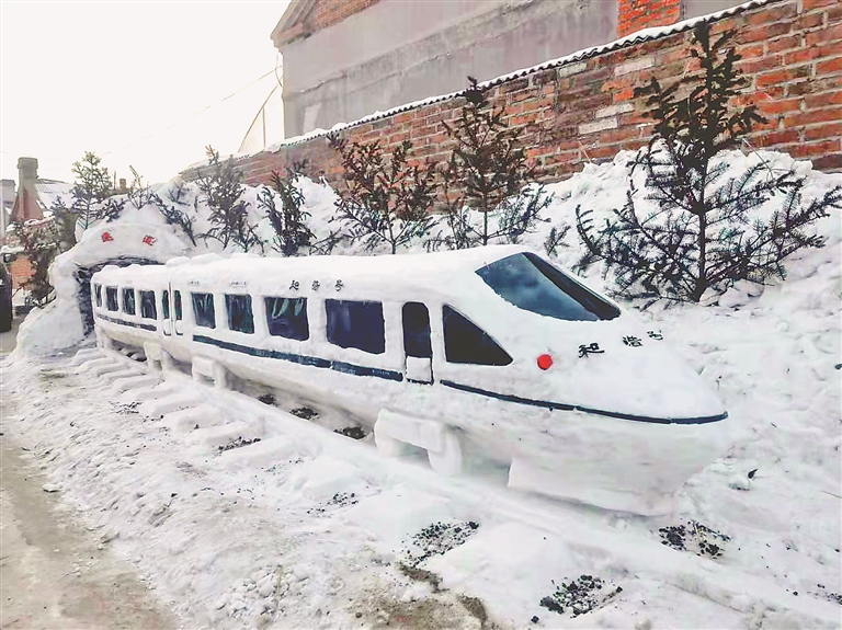 陈永江用雪堆雕出的“和谐号”。佳木斯市东风区松江乡新民村提供