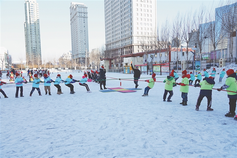 呼兰区各学校组织开展学生寒假期间上冰雪活动,保持冰场开放,同时根据不同年龄段学生体质情况,布置体育冰雪作业,广泛开展雪地徒步、堆雪人、跳绳、踢毽子、抽冰尜等户外趣味性活动。