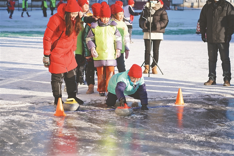 道外区连续举办27届的冰尜比赛,已成为“经典曲目”,深受学生们的喜爱;南岗区继红小学冰雪大课间和特色冬季冰雪课程已成为本校校本教材并深得学生们的欢心;松北区各学校开展了丰富多彩的比赛,例如实验学校的冰壶比赛、乐业二中的速滑比赛等,大大提升了学生对冰雪运动的兴趣。