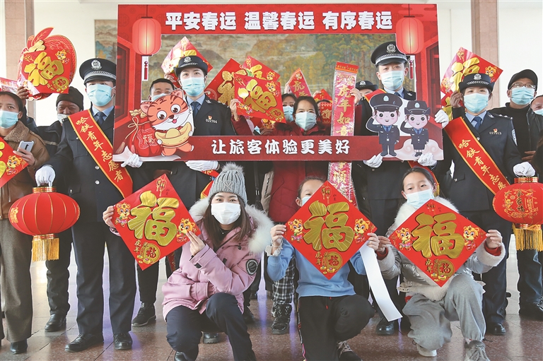 春运临近,为营造安全、温馨、有序的出行环境,齐齐哈尔铁路公安处组织青年民警志愿者深入车站、列车开展“铁警送福、情暖出行”活动,为过往旅客送上福字、春联以及新春的美好祝愿。