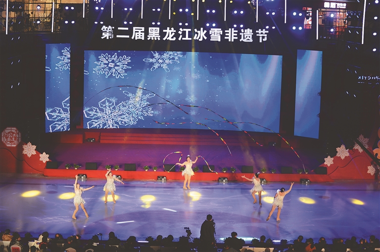 随后,舞蹈《吉祥北国》拉开开幕式专场演出序幕,歌曲《给你一点颜色》、冰上杂技《冰秀》、舞蹈《草原》、古筝演奏《战台风》、民族服装秀……一个个以非遗为主题的歌舞表演和技艺展示,带给人们一场精美绝伦的视听盛宴。最后,开幕式活动在《我在黑龙江等你》的热烈旋律中圆满结束。