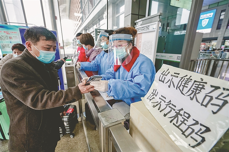 1月17日,在浙江省湖州市长兴站进站口,防疫工作人员和辖区志愿者查验进站旅客健康码、行程码。