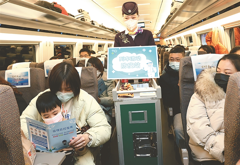 1月16日,乘务员在上海虹桥开往汉口的G1724次列车上向旅客分发防疫宣传册。