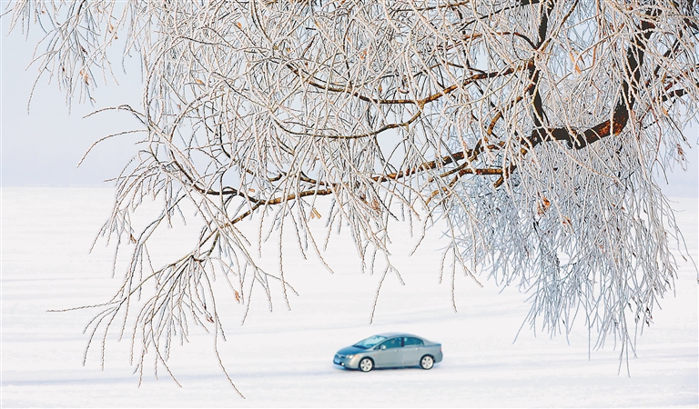 27日,哈尔滨市出现雾凇美景。在道外区松花江畔,岸柳挂霜,玉树琼枝,把冰城装点得宛如晶莹的童话世界。