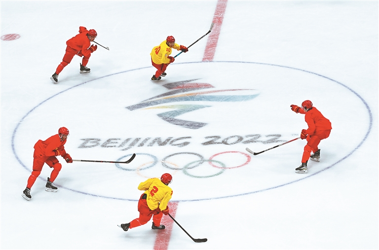 1月28日,中国男子冰球队在国家体育馆进行北京冬奥会赛前首场训练。 图为中国男子冰球队队员进行训练。新华社发