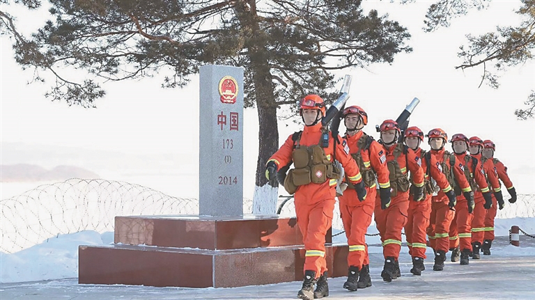 8时整,漠河市大队十三中队消防救援人员准备完毕后,与北极派出所民警一同踏上了北极村边境线及周边林区进行巡护。