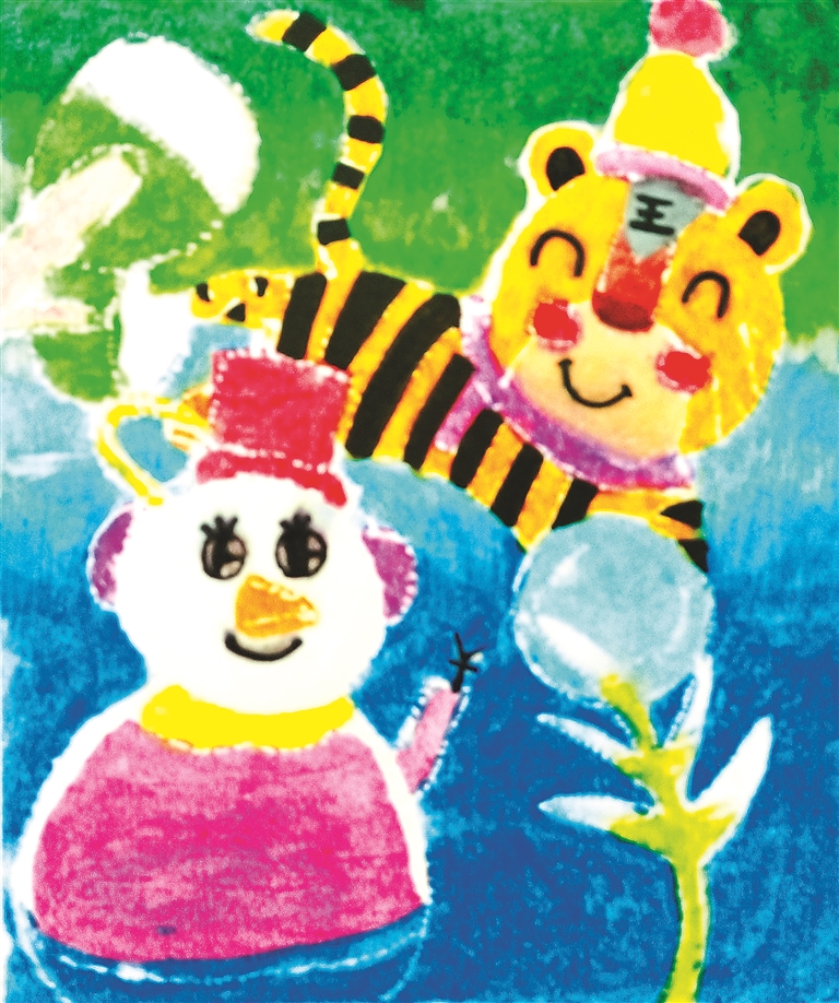 加区一小作品中采用传统水印的表现形式,清新自然,充满儿童的想象力和活力,让大自然变得更美好、生活充满温馨与快乐。王雪艺同学的《老虎与雪人》,充满了想象,童话色彩的小雪人似乎在和拟人的小老虎玩耍,充满友好的气氛。尹航同学的《山中王》充满儿童画色彩,山中王似乎在景色宜人的山水间等待自己的朋友们,充满着期待,背景是大山运用了不同的绿色,让画面丰富又滋润,水印特征突出。