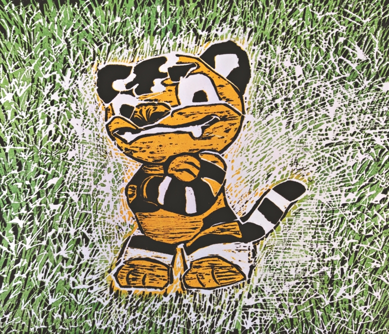 加区二小的小老虎,采用了油印套色木刻的形式,有的惟妙惟肖,有的天真有趣,吴雨坤同学的《金虎》用了黄色和红色作为主色调,刀工细腻写实,展现出来金光闪闪的耀眼光芒,似乎寓意着2022年会一切如愿。呼中的小老虎有的是彩铅绘制,大大的2022、彩色的烟花庆祝新年的到来,有的是运用马克笔的特有艳丽效果,绘画出了水印木刻的感觉,飞跃的鲤鱼、绽放的莲花、红红的灯笼,每一个符号都代表着吉祥如意,别有一番趣味。