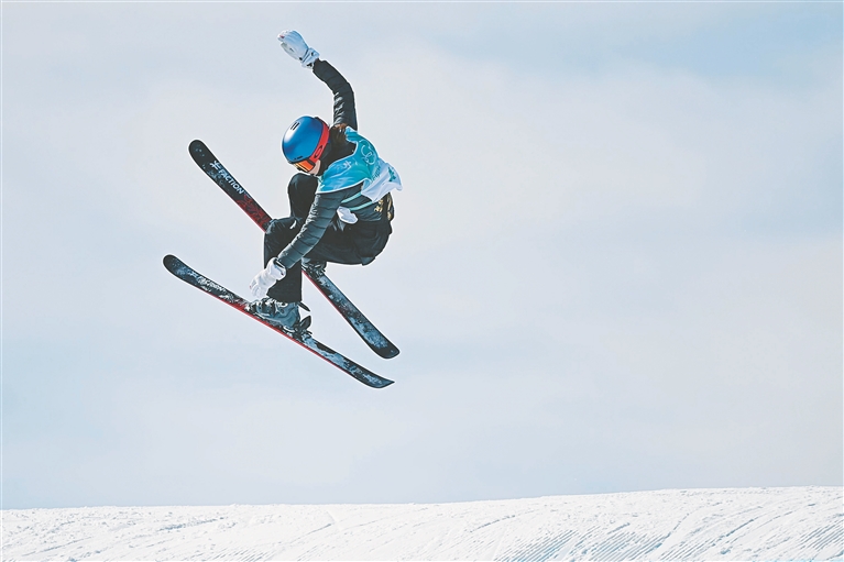 2月5日,中国选手谷爱凌在北京首钢滑雪大跳台进行赛前训练,备战即将开赛的自由式滑雪大跳台项目。