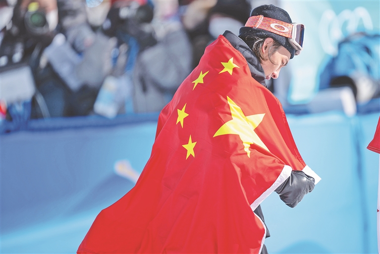 日历翻回2022年2月7日,北京冬奥会单板滑雪男子坡面障碍技巧比赛结束,苏翊鸣站上领奖台,高举双臂。观众席,工作区,甚至坡障赛道最后一个跳台区的高坡上都站满了人,现场数不清有多少面五星红旗在飘扬。