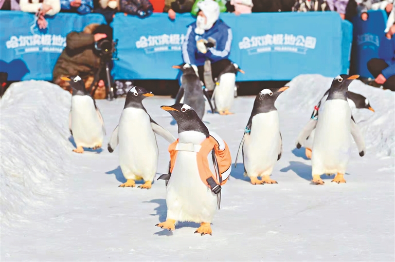 哈尔滨极地公园“淘学企鹅”小分队在室外巡游,游客免费欣赏。