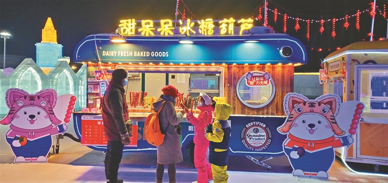 春节期间,哈尔滨冰雪大世界创新推出新春活动“万物皆可冰糖”。在这里,除了能吃到传统的冰糖葫芦、冻梨、冻柿子等美味,还能一尝冰糖辣椒、大蒜、大葱、香肠、辣条、西蓝花、方便面、生姜等多种美食!不仅如此,现场还有祈福和抽奖活动,游人争相为虎年吉运讨个好彩头。初一开始,冰雪大世界还举行了“新春达人打卡活动”,邀请微博、抖音、小红书等平台上的大V来园区打卡,和达人粉丝一起为冬奥助力加油。