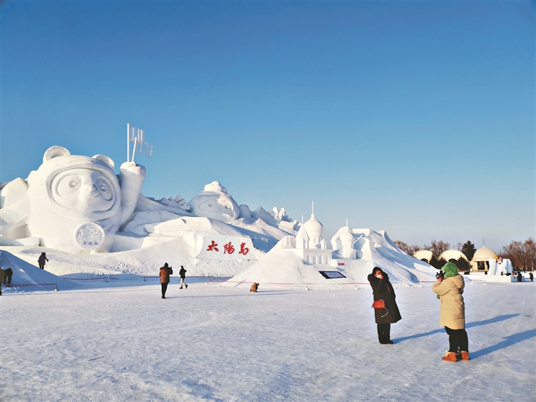 在哈尔滨太阳岛雪雕艺术博览会景区,不同奥运题材的雪塑使游人对奥运精神更加向往。尤其是主塑《冬奥·太阳岛之旅》,长100米,高30米,以“冰墩墩”“雪容融”形象以及哈市地标性建筑为主设计。这个太阳岛雪博会有史以来最大的卡通单体雪塑,也是世界上最大的卡通单体雪塑,引来众多游人。在冰雪娱乐区,冰上自行车、雪滑道、冰滑道等也很受欢迎。