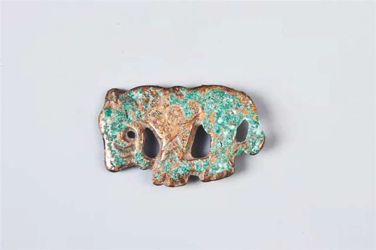 牌饰青铜质,长4.6厘米、宽2.6厘米,近长方形。正面铸有虎纹,作垂首伫立状,虎口大张,利牙竖立,呈锯齿状;虎爪打开,形状清晰;尾部下垂,尾尖向上卷曲。虎的脖颈、躯干以及四肢上均刻有不同形状的花纹。铜牌背面中间处有一宽直钮,可用于穿绳佩戴。此牌饰没有边框,以虎形躯体为边,采用透雕技法,利用流畅的线条刻画出虎的凶猛,造型生动独特,风格粗犷夸张,颇具北方草原文化特征。从纹饰看这类牌饰流行于春秋晚期,为拓跋鲜卑及其先世的遗物。