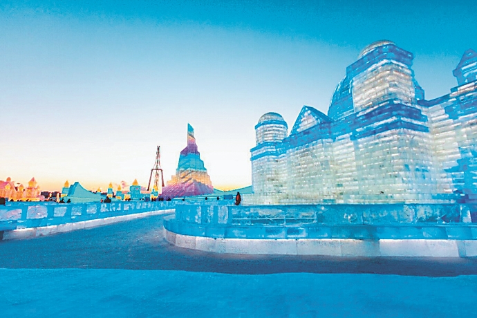 雪是洁白无瑕的,冰是晶莹剔透的。在世界最大冰雪主题乐园——哈尔滨冰雪大世界,冰雪可以是五彩斑斓的。这些取材于松花江面的大冰块,在白天展现了冰与雪的极致浪漫,宏伟的冰体建筑晶莹剔透,雪雕作品洁白如玉。待到夜幕降临,周围旖旎的灯光亮起,七彩琉璃闪耀着璀璨的光芒,照亮了冰城上空。