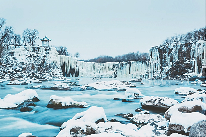 从哈尔滨向东出发,来到世界最大的火山熔岩堰塞湖——镜泊湖。夏日奔腾咆哮的吊水楼瀑布在冬季可形成厚达两米、宽达数百米的冰瀑,似冰山耸立,是中国规模最大的冰瀑布。当夜幕降临,冰瀑被灯光点亮,银色的冰柱以及周边的悬崖峭壁、树木等由远及近全部勾连起来,呈现出光影交织的水墨长卷。