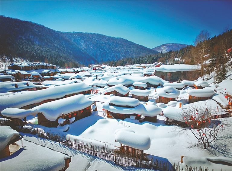 此时的雪乡,飘落的雪花正在屋顶、柴垛上翩翩起舞,为世人再现了童话中的冰雪王国。走在雪韵大街上,穿着花袄,左手冰糖葫芦,右手雪糕,双脚踩在松软的雪堆上吱吱作响;坐一趟马拉爬犁寻找儿时快乐;吃一回铁锅炖感受东北风情;爬一次羊草山看日出东方……这里的雪景,每一帧都摄人心魄,藏着你我心中向往的诗与远方。