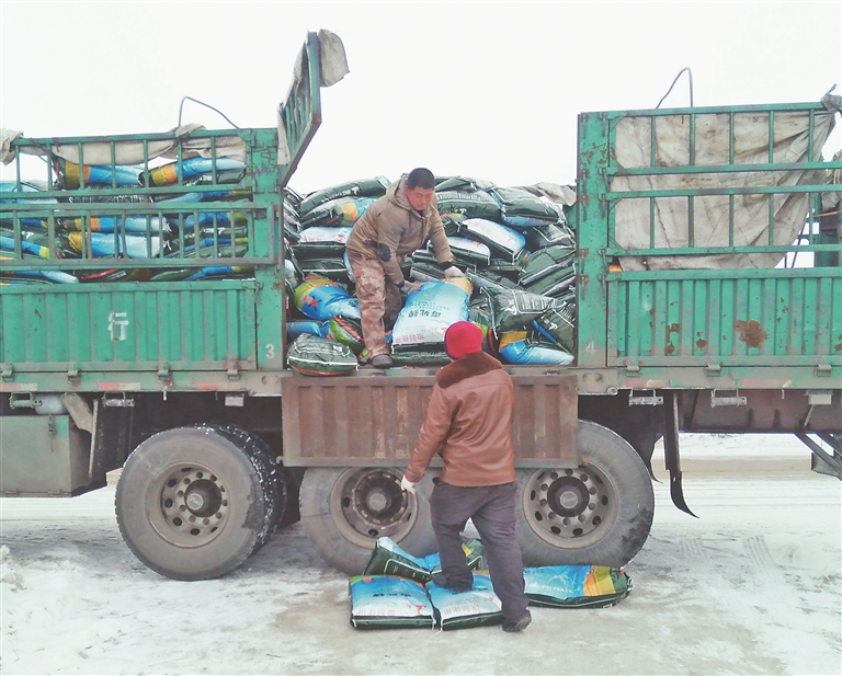 合作社社员正在把化肥卸车。