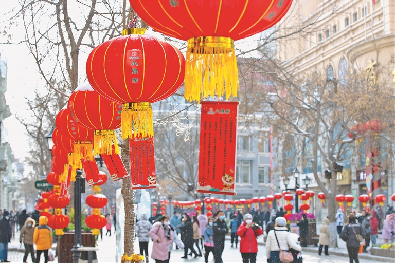 2月15日,在哈尔滨市中央大街,高悬的红灯笼上挂满灯谜。 随着元宵节到来,各地举行丰富多彩的活动,热热闹闹庆佳节。 新华社记者 张涛摄