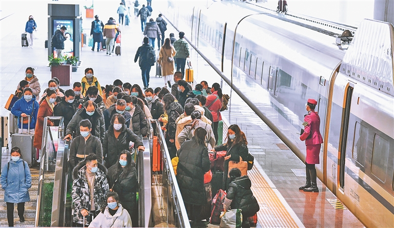 2月16日,旅客乘车抵达贵州省贵阳北站。 当日是元宵节后第一天,各地铁路迎来节后客流出行高峰。新华社记者 杨文斌摄
