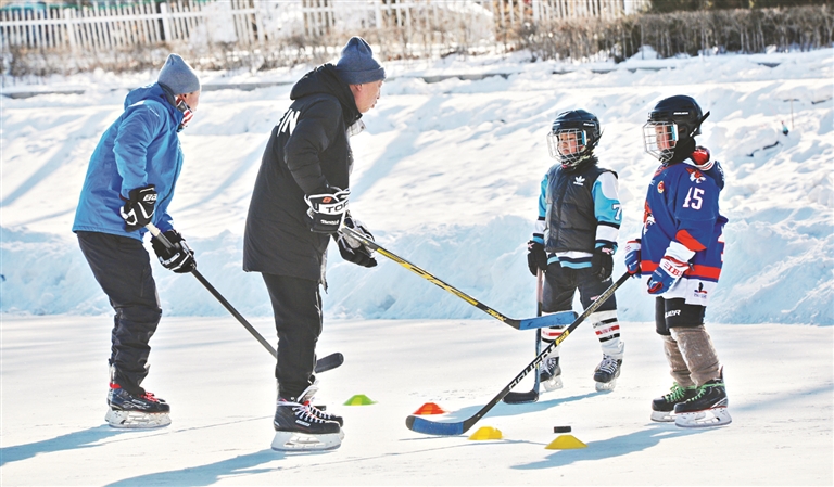 北京冬奥会在“冰球之城”齐齐哈尔刮起冰雪运动旋风。在龙沙公园劳动湖冰面冰场上,两名冰球少年在教练指导下苦练冰球技术,尽享冰球运动带来的乐趣。
